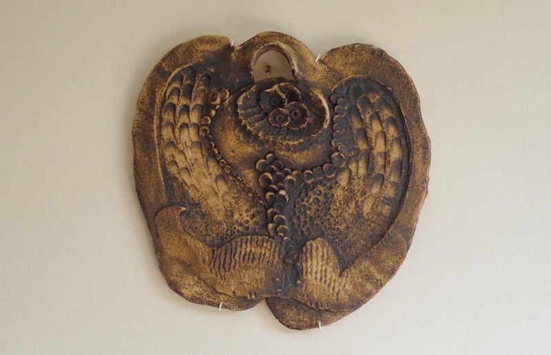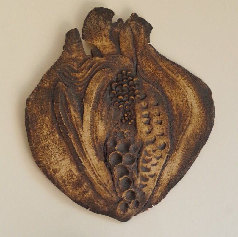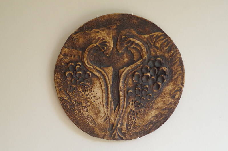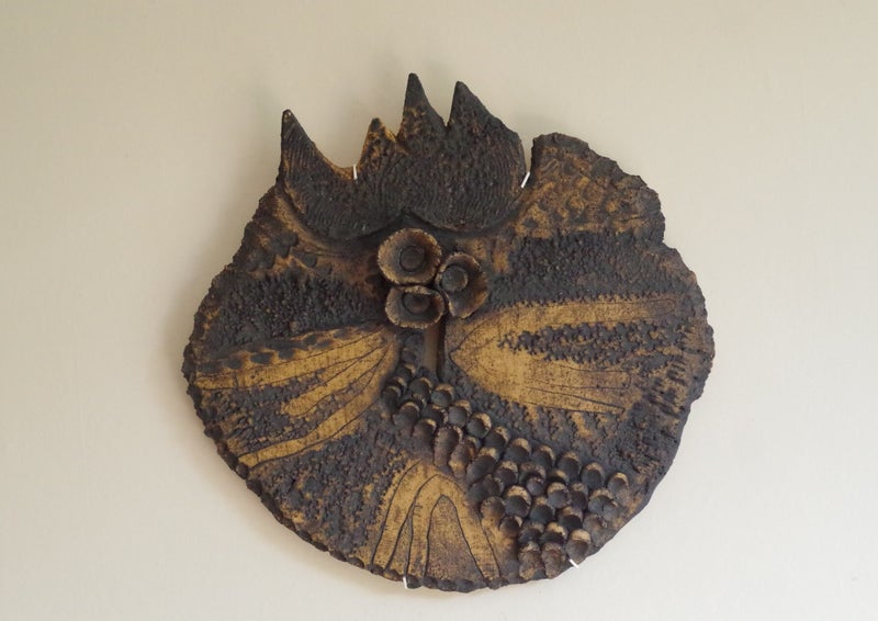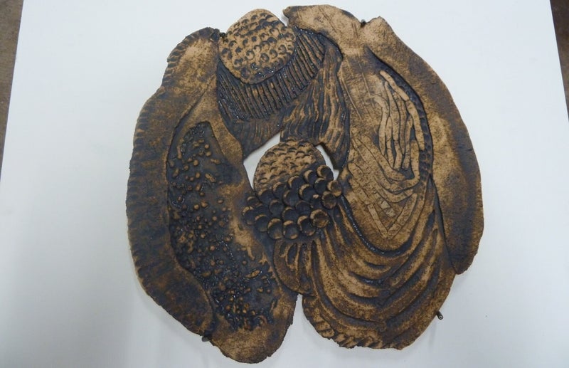 For wall mounted plaques Roland uses a coarse clay containing grog (grit) which is slabbed, cut, sectioned and re-arranged. Surface textures are added and when dry, coated with copper oxide. Wire wool is used to create tonal variations before bisque firing.